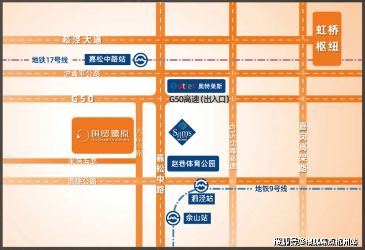 交通方面,项目距离最近的地铁站是9号线佘山站,步行有一些距离,日常出行需依赖自驾。约2.5公里即达G50高速入口,临近嘉松中路、沈海高速、嘉闵高架路等主干道,可以快速直达虹桥商务区。