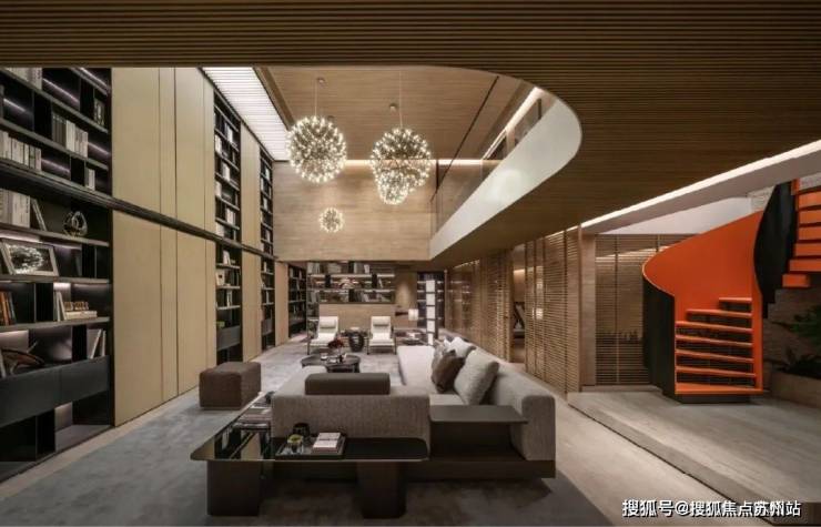 书架以及空间中预先设定的轮廓线条,精准地勾勒出隔而不断的空间形态.书架仿佛具有神奇的魔力,打破了空间的界限,将会客区、餐厅、书房与文化韵味巧妙融合,每个区域既相互关联,又有着各自独特的层次,形成了一种和谐而又富有变化的空间秩序.