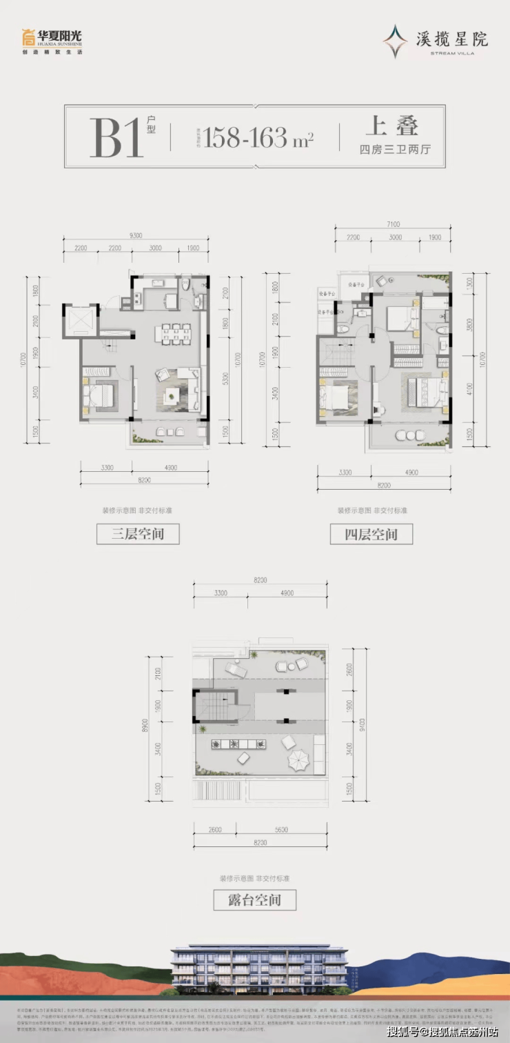 建面约158~163㎡上叠:顶层景观阳台/餐客一体连厅/套房式主卧/舒奢三卫设计