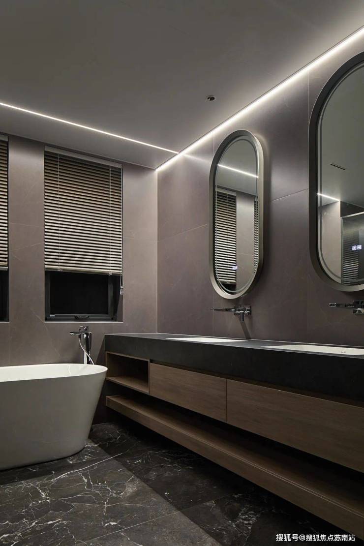 主卫不动声色地延续着整个意式空间的低奢内敛品质,大面积使用黑白纹理的【爱力蒙特∙黑金帝国石】铺装,石材质感独特,纹理自然流畅,形成强烈视觉冲击,整体空间简约大气。双台盆的设计,干湿分区布局,为居住者的生活使用带来便利。