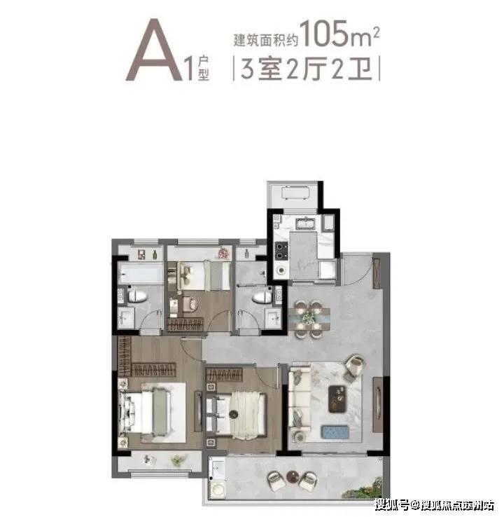 建筑面积约105㎡,3室2卫▼