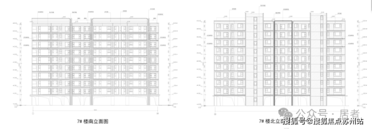 7#标准层平面图如下:同步曝光2个户型,2梯3户。3#标准层平面图如下:同步曝光1个户型,2梯4户。3#南、北立面图如下:层高3.1米,米白色、银白色、灰色铝板外立面。14#标准层平面图如下:同步曝光1个户型…
