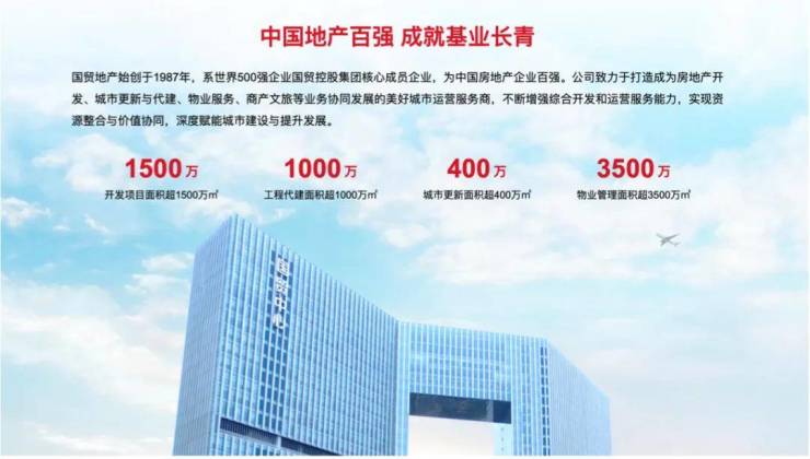 旗下的国贸地产,为国贸股份全资子公司,始创于1987年,连续9年荣获“中国房地产开发企业100强”、连续3年获得“中国房地产开发企业运营效率10强”和“中国房地产开发企业品牌价值华东10强”,拥有“金钥匙”品牌商标。