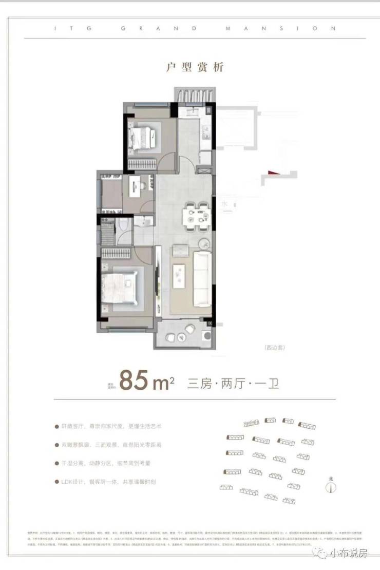 户型解析:约85㎡的3房,这种入门级的产品也要保证居住的尺度感。比如利用L形厨房与餐厅相连接,一体化的设计让空间充足利用。比如次卧连接阳台,就是人性化考虑到给他们一个私密的追光天地。
