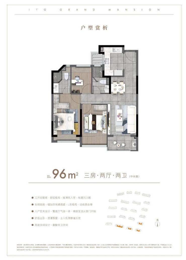 户型解析:约96㎡的3房,这种进阶级的产品当然最能体现舒适感。比如在入户动线上,客餐厅LDK设计更能凸显与家人的亲密交融。同样也利用客厅阳台,次卧阳台,主卧飘窗,北向书房飘窗这些更多的开窗面,向阳而生。