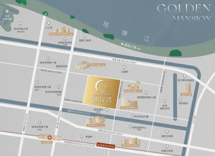 坐拥钱塘江唯二的270度江湾,西连亚奥中心,东接国家级临空经济示范区,既有19号机场快线、跨城高速、城市高架等多维交通路网,又临近萧山国际机场、东站高铁枢纽,尽享湾区之心“四港联动”(海港、陆港、空港、信息港)的畅快与便利。