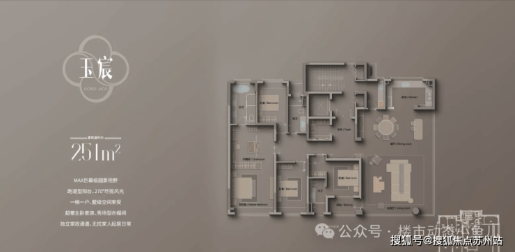 约251㎡为4房3卫豪华边厅大平层,带一个家政间;南向双套房,约19.5米面宽,客厅南向开间约7.1米;西侧外接超10米开敞阳台,南次卧外接封闭阳台,主卧套房设计,开间约4.3米,主卫双台盆带浴缸。