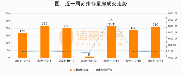 从存量房来看,2024年10月16日苏州存量房单日成交210套,比昨日增加24套,环比上涨12.9%。从近一周存量房成交来看,苏州存量房日均成交套数为171套,10月16日单日成交210套,高于近一周平均水平22.8%。