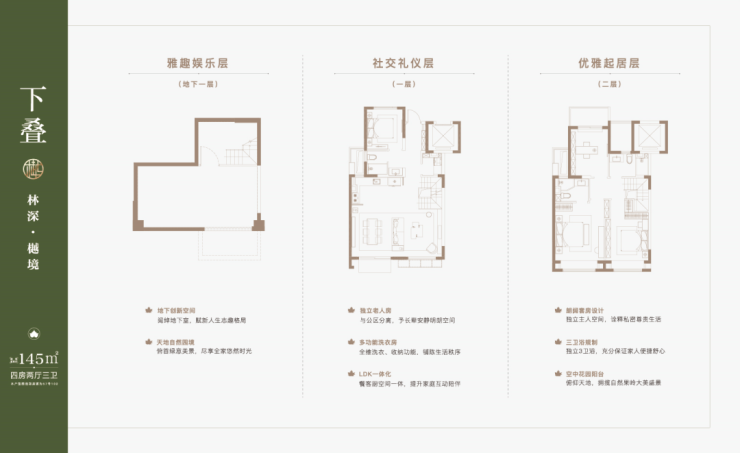 建筑面积约91-144㎡ 低密叠墅(复式住宅),则为改善置业者提供了新的选择。庭前一方天地、巨幕宽厅、星空露台、地下空间,称得上是城市墅居的理想范本!