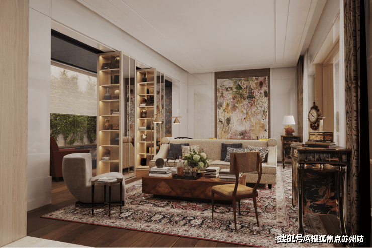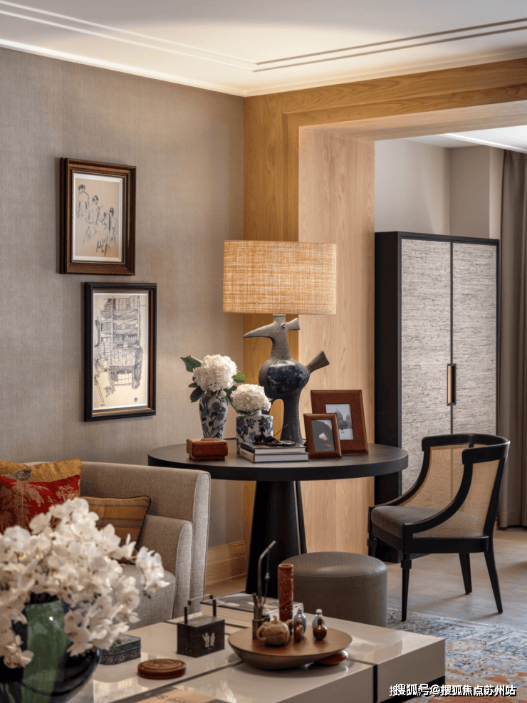 客厅,也是一处流动的空间,通过“自由灵活的组合”营造不拘束的社交空间,家具摆放,连而不挡,分而不隔。满目吸睛的艺术品,错落布置的家具,丰富着空间的视觉层次。