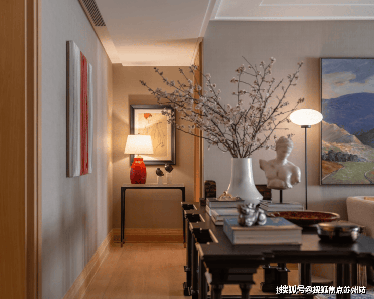 玄关是空间过渡的前站,是外部世界与私人领域之间的节奏转换地。通过材质、肌理、色调的搭配组合,构建具有电影质感的归家场景。作为空间的重要组成部分,艺术品恰如其分地妆点其中,让主人的风雅志趣一眼可见。