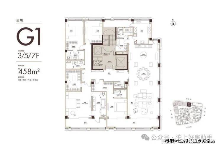 南向客厅灵动分区,双采光庭院引光入室,多卫设计便捷舒适。