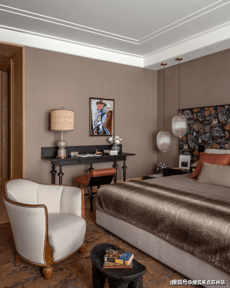 卧室去繁就简,以沉静温暖的配色和材质,营造和平宁静的氛围。一幅山水花园刺绣屏风点缀其中,予人舒适松弛之感。可移动家具组合,既独立又彼此链接,便于情感交换。