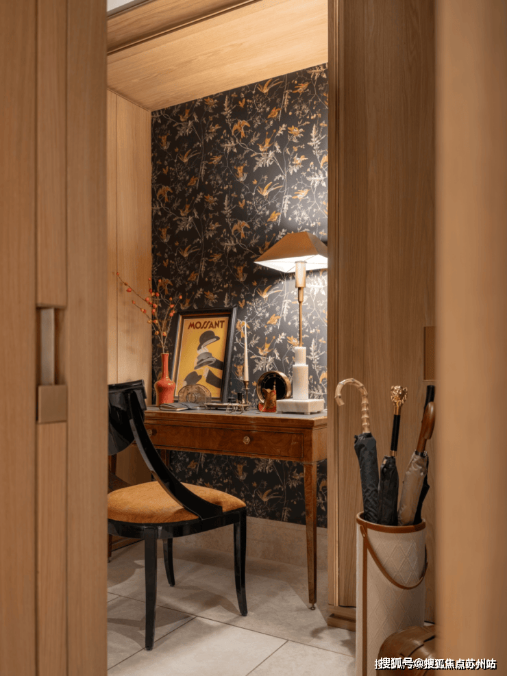 玄关具有变化性与功能多重性,壁纸融合中西方色彩和纹样,除了更衣功能,更摆放了古董书写桌,以手写文字传递信息,传递慢节奏生活方式,丰富空间的装饰和功能,目光所及视角变得丰富。