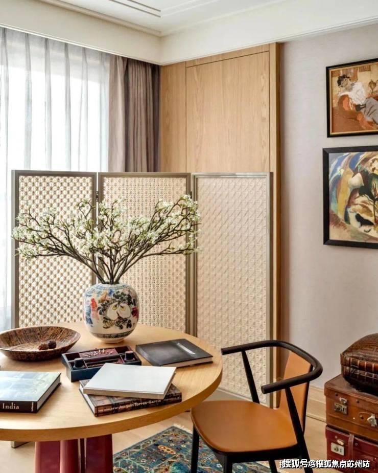 多功能书架彰显着设计的巧思,形成有如博物馆般的展示方式,即可放置日常读物,亦可展示珍本藏书。同时,利用屏风做隔断,与圆桌结合形成私密空间。