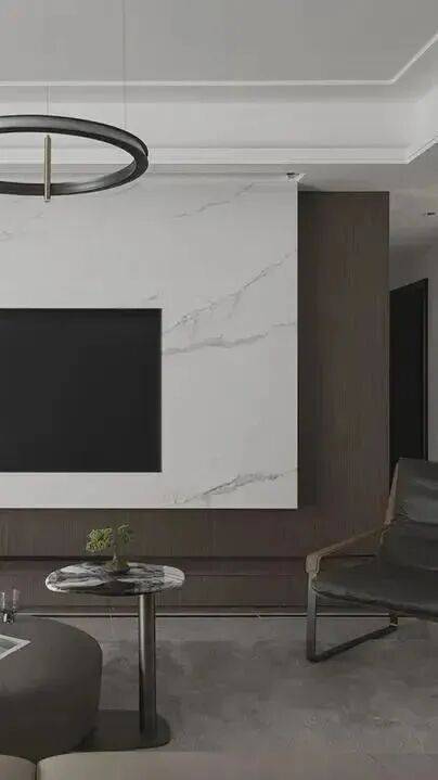 客厅部分以白色深棕为主,在交错间奠定沉稳大气的基调.独特的大理石岩板背景墙,高级感max,搭配低饱和沙发,让空间充满设计与质感.