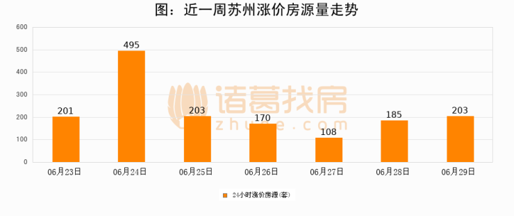 根据诸葛找房数据显示,苏州24小时涨价房源量为203套,较06月28日增加18套,环比上涨9.7%。与此同时,涨价房源占比小幅扩大,业主信心有所提升。
