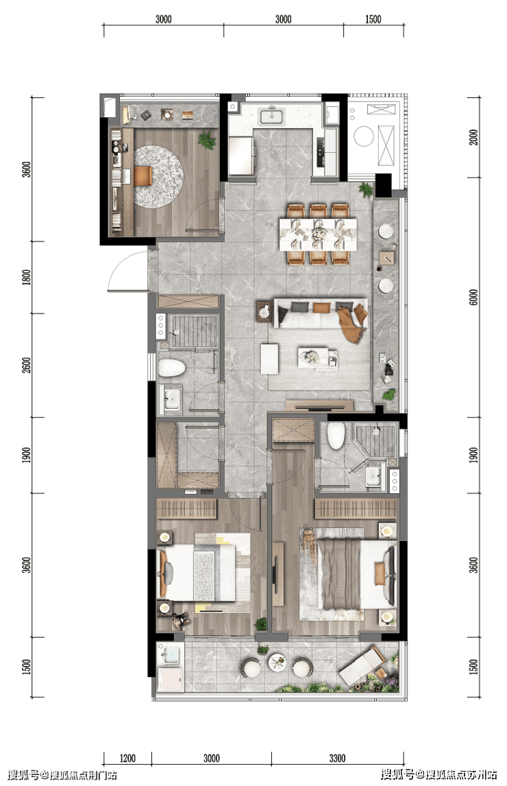 LDBK一体化的公区,充分实现了家庭成员间的互动;除了边厅外接的阳台外,南向次卧同样设计了阳台,兼顾了景观和晾晒的需求。