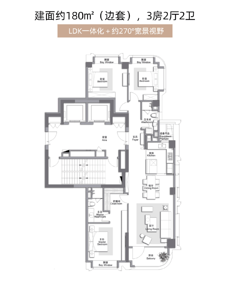 再来看建面约180㎡3房2厅2卫(边套),也是此番最后一次加推的户型。