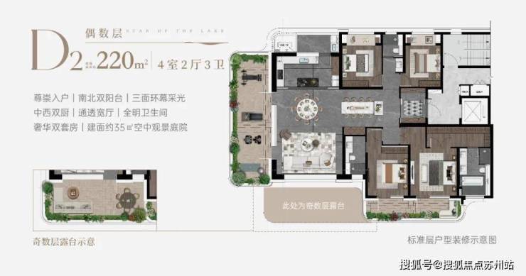 其中约220㎡奇数层空中庭院连接南向阳台,形成长约15.65米的南向全景界面,约是普通户型的3倍采光。依次将客厅的社交温度、次卧的静谧时光、主卧的私享领域,串联成全家乐享的空间诗篇,无论是周末的烧烤派对,还是深夜的独处小酌,都能找到最惬意的姿态。