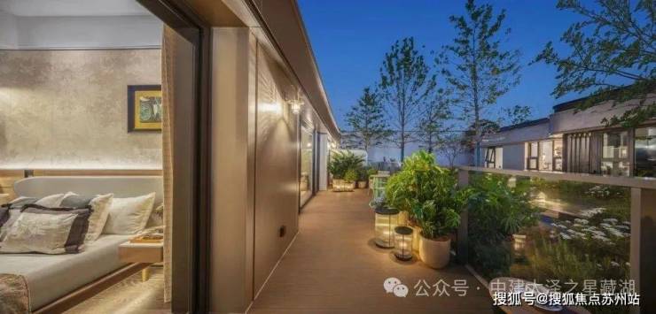 中建·太泽之星| 藏湖空中庭院约3.3米超大进深(建面约240㎡户型),相较于传统阳台的短进深,可同时容纳休闲区、绿化区、功能区的复合布局。