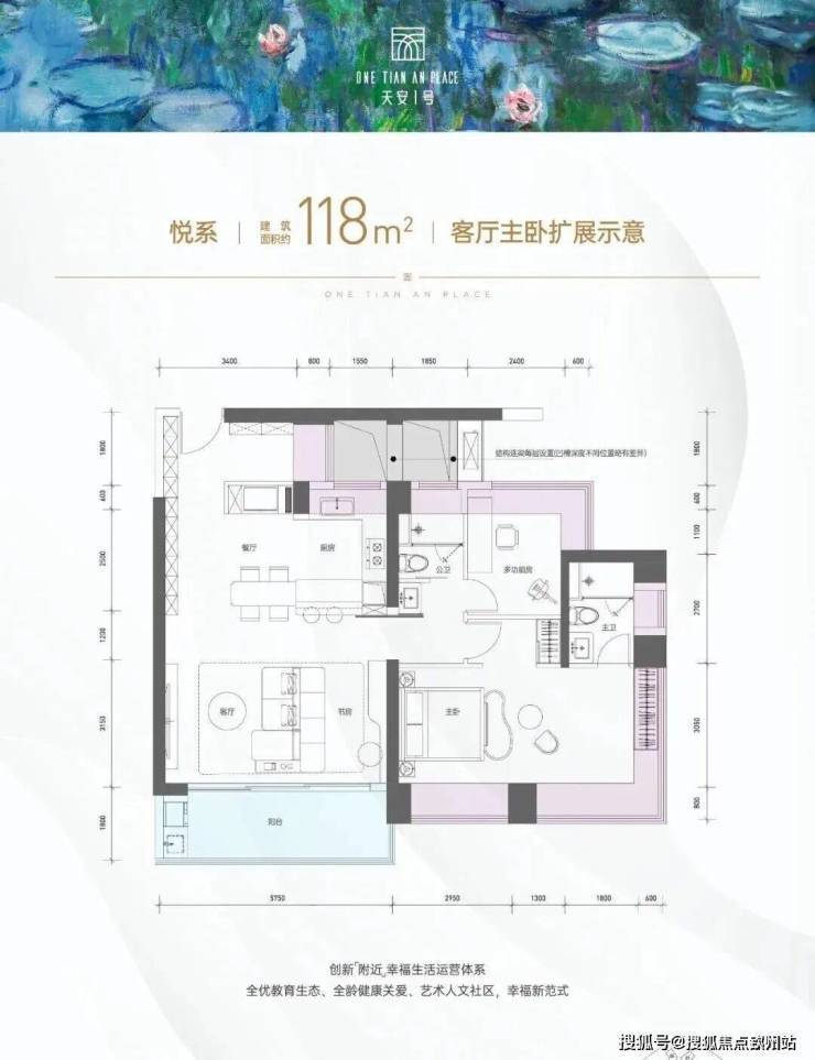 作为入门级改善户型,有3房和2房的选择,118㎡悦系在户型图中展现“客厅扩展示意”:通过拆除部分非承重墙,客厅开间从3.5米扩展至5.75米,形成约28㎡的家庭活动区,可容纳孩子玩耍、家人聚会等多场景。