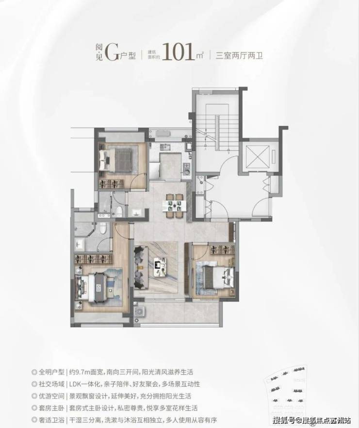 建面约101㎡的F和G户型都是市面上备受认可的飞机经典款户型。