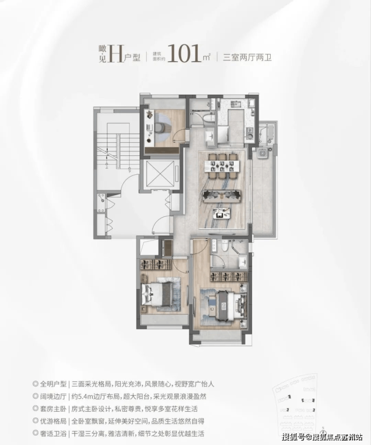 建面约101㎡H户型:三面采光,全能景观王炸边厅户型!