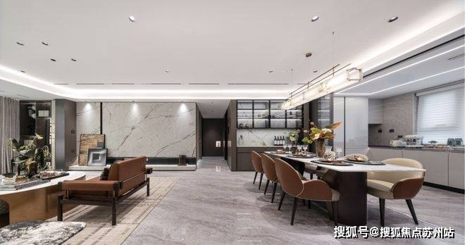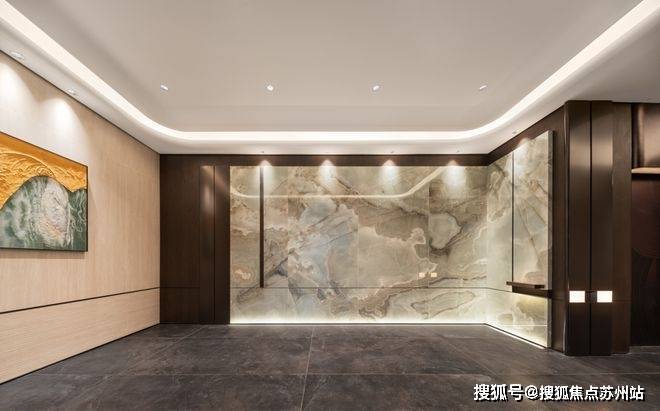 也体现在昂贵材质的铺陈和点缀,比如玄关处的透光云石、背景墙的玛瑙玉石岩板,就连岛台奢侈的装上了同款岩板立面。这样的配置,全苏州是第一家!