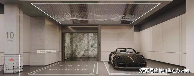 地下车库是高端生活必不可缺的“第三空间”。项目连坡道、地面、吊顶都升级营造出质感与审美。顶部是穿孔铝板的星空图案,两侧仿岩纹碳素板+金属板,搭配透光云石材质的天誉东方LOGO发光标识,既高级又尊贵。