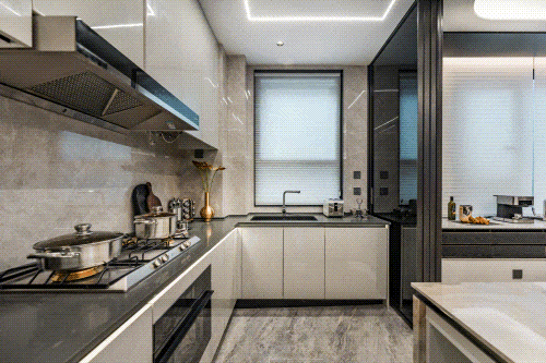 餐客厅阳台组成LDKB超大社交方厅,近80㎡的奢阔,相当于设计了一个“私人会所”。6大功能区,具有中西厨房功能,岛台/酒吧、餐桌,还有休闲区、交流区和观景阳台,享受空间自由,会客访友,可多场景切换。