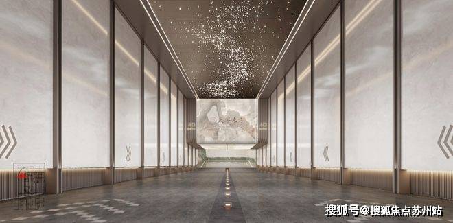 整个门头外立面主要是深灰色石材,门厅迎面而来的是一面进口翡翠蓝奢石景墙,据了解,这面景墙含蓝量极高,造价昂贵。顶部是3D钻石星光穹顶,地面是仿古铜案名地刻以及专属的“万字纹”地砖,气势恢宏,把归家的排面感拉满。