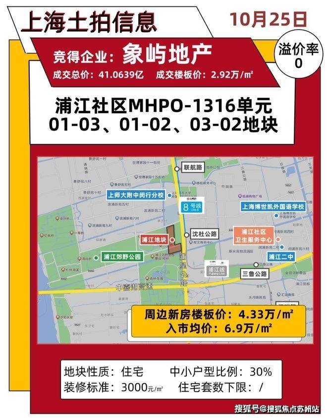象屿•天宸雅颂售楼处电话☎:400-882-8814(预约热线)✔✔✔象屿前滩南项目是上海2024年第六批次出让的,象屿以底价41亿+拿下闵行区浦江镇MHP0-1316单元01-02、01-03、03-02地块,全部为住宅用地,全装修比例50%,中小套比例30%,装修标准3000元/㎡。