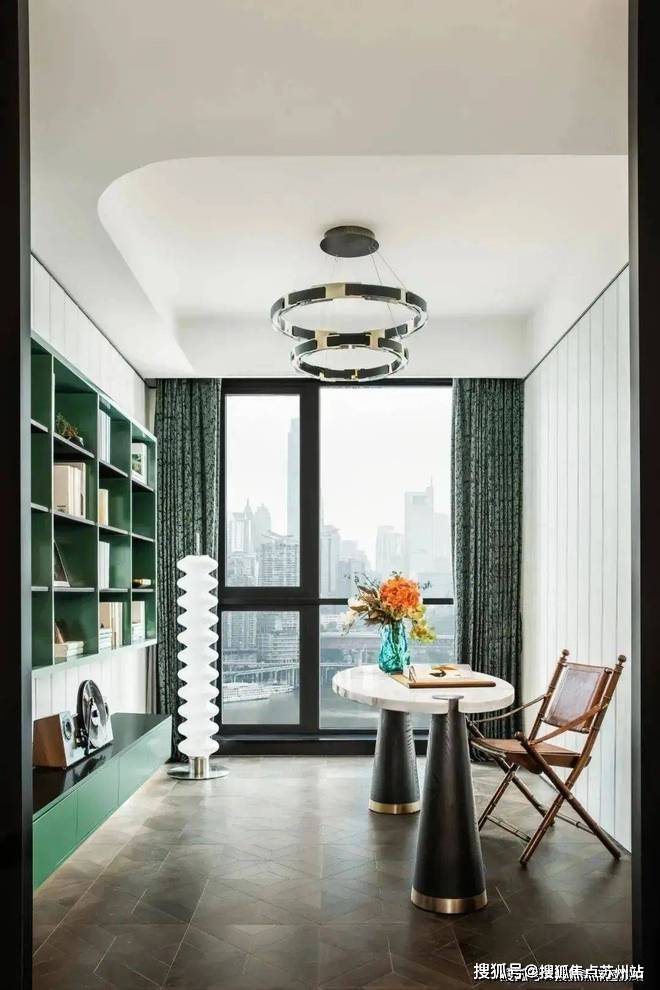 The flexible space focuses on the combination of functionality and comfort, and natural light pours in through the wide Windows, which complement the elegant wooden bookshelves, creating a relaxed and peaceful atmosphere.