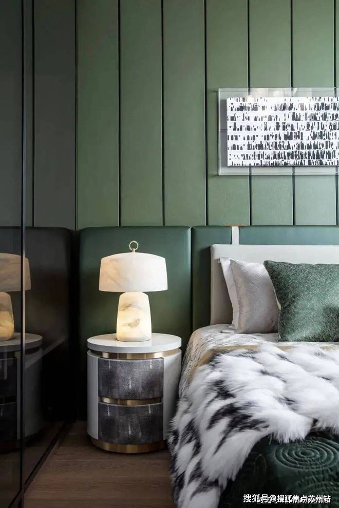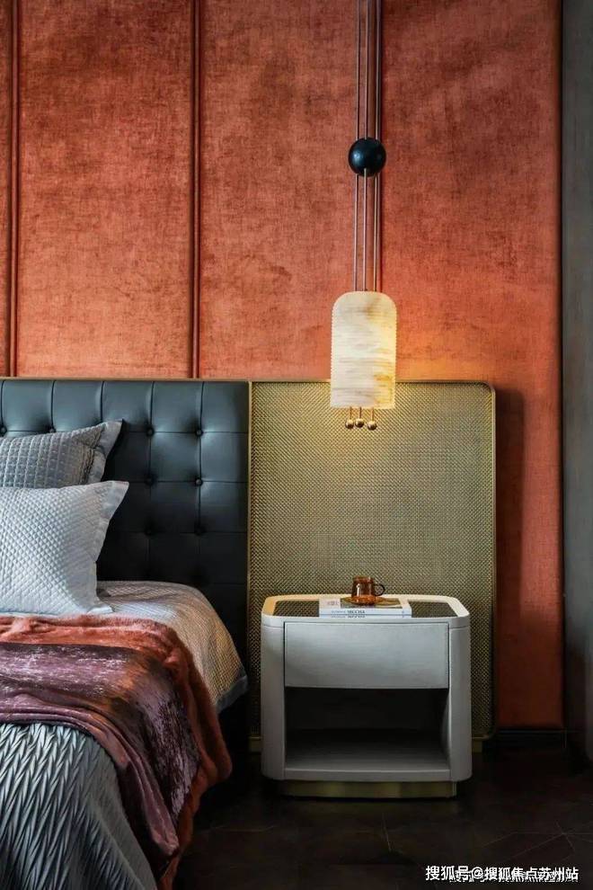 床头的背景墙设计巧妙而独特,皮料的柔软触感与金属的冷硬质感相互碰撞,形成了一种既现代又古典的美学风格,既展现了业主的非凡品位,又彰显出一种无法言喻的贵气。它们不仅提升了整个居住空间的品质感,更让业主在日常生活中能够感受到一种高品质的生活体验。