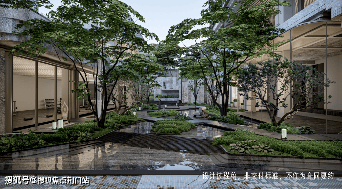 当业主在恒温泳池、健身房、瑜伽室或是私宴厅,都能透过玻璃,欣赏到下沉庭院的溪涧美景。