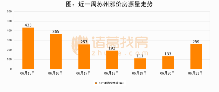 根据诸葛找房数据显示,苏州24小时涨价房源量为259套,较06月20日增加126套,环比上涨94.7%。与此同时,涨价房源占比小幅扩大,业主信心有所提升。