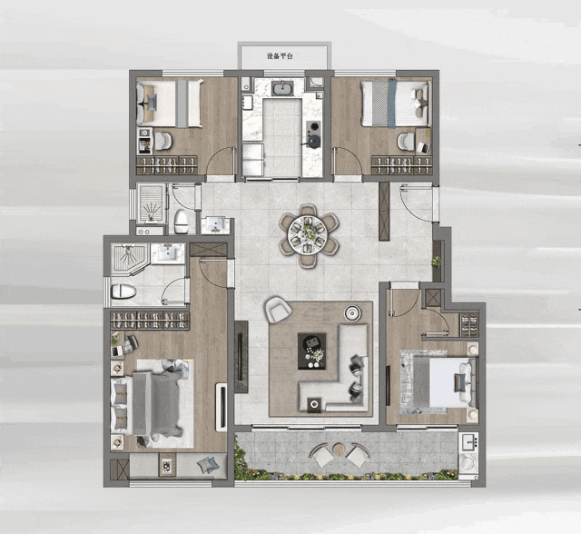 四个卧室如同四叶草的叶片一般舒展于四个方位,相互贯通又独享私密.一个房间给父母,一个房间做主题儿童房,还有一间奢阔主卧套房犒赏主人,尺度感和空间感拉满,以客厅作为连接,满足三代人的生活所需,让生活纵享私密的同时,更有温度.老人品茗下棋,孩子摆弄玩具,一家人各得其乐.