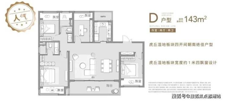 136㎡和143㎡户型分布于8幢小高层,均是四房四开间朝南,大横厅或者双联阳台可选,属于市场上主流的改善产品。值得一提的是,项目赠送的约一米进深大飘窗据说是板块内最宽飘窗。