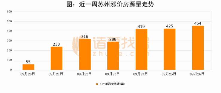 根据诸葛找房数据显示,苏州24小时涨价房源量为454套,较09月25日增加29套,环比上涨6.8%。与此同时,涨价房源占比小幅扩大,业主信心有所提升。
