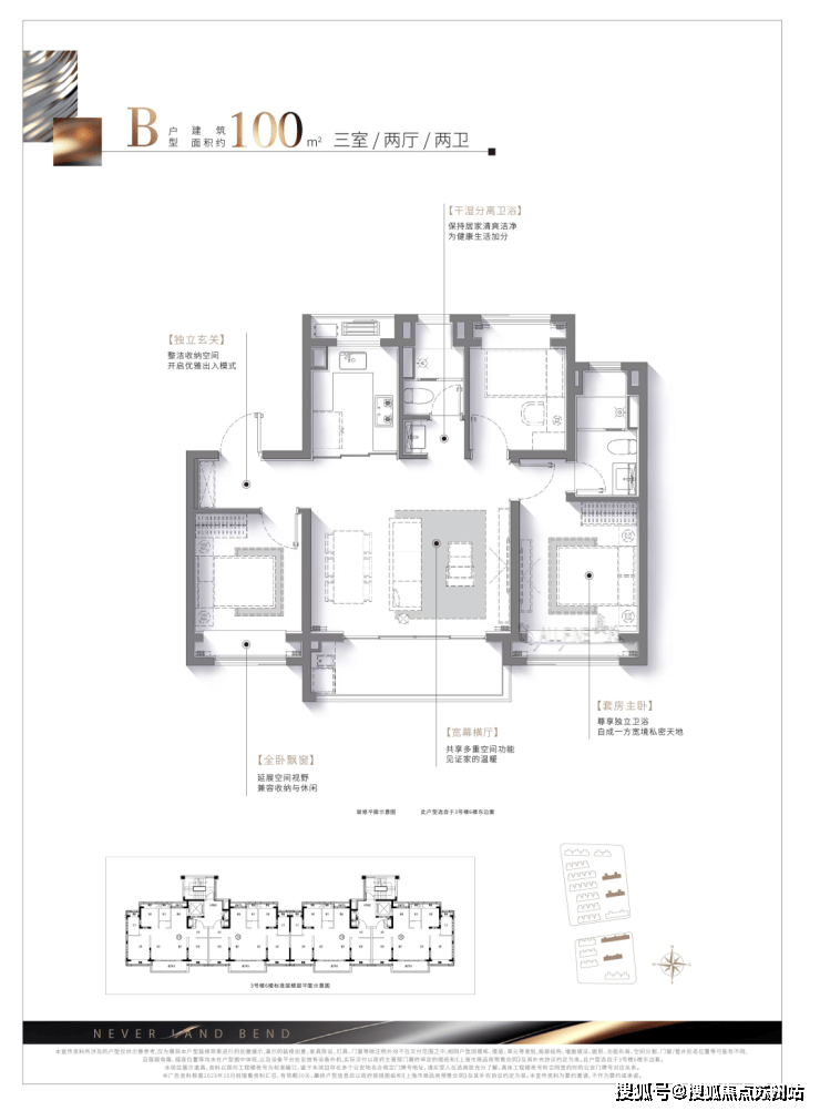 招商云澜湾售楼处电话:400-8787-554建面约100㎡的三房两厅两卫户型,可以说是约96㎡3房的升级版,空间更加延展,整体横厅面宽约5.2米(轴中距),形成更大的南向采光面,且搭配南向观景阳台,直接做到了3.5面宽朝南,这在同类产品中是比较少见的。