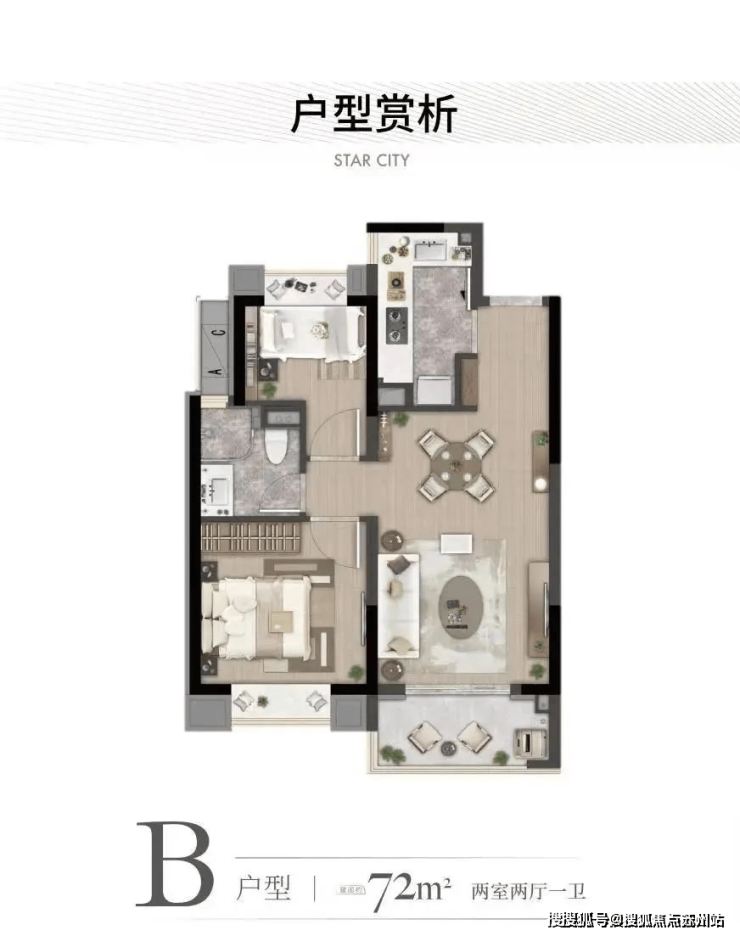 对于单身、新婚夫妇以及三口之家来说,该户型都已经够用!