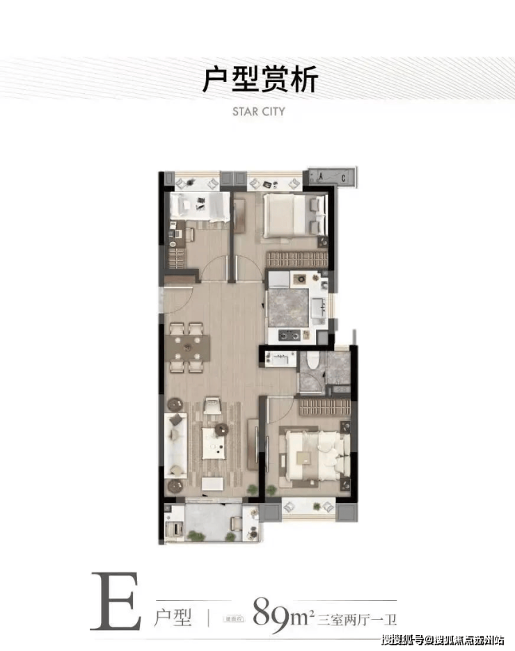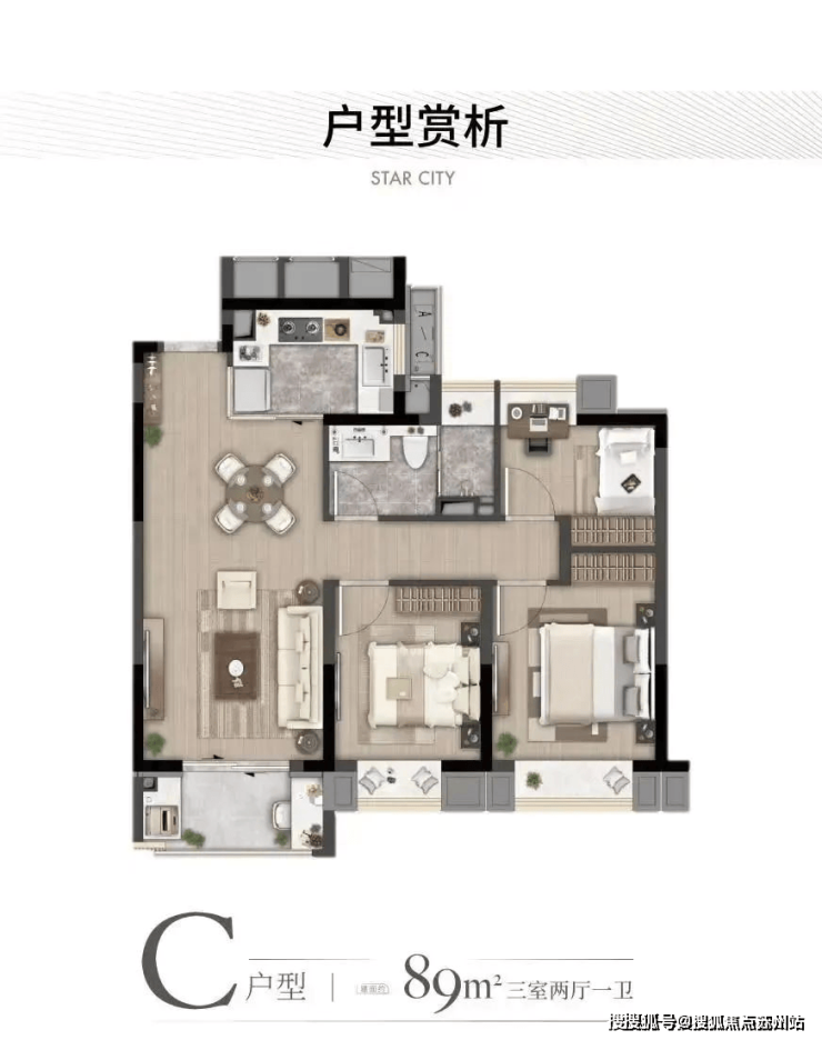 虹桥灿耀星城售楼处电话:400-8123-664建面约89㎡的户型在俊灿星城竟然做成了3房的产品!尤其是C户型!还做到了三开间朝南!动静分离!不得不感慨下俊灿星城的户型设计真的是从居住的角度出发了!