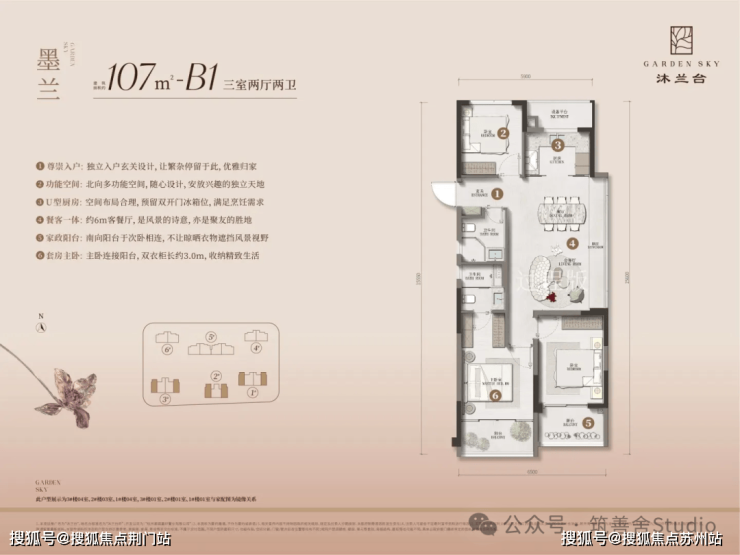 项目规划六栋13至24层的高层住宅,采用合理的围合式布局,实现空间的最大化利用与居住环境的优化。社区核心区域,一条设计巧妙的露天景观水系曲折流淌,与古色古香的亭台相得益彰,四周绿树环抱,集中绿地生机勃勃,户外运动场地一应俱全,为居民提供理想的休闲健身空间。此外,高达42米的楼间距设计,确保了每户家庭的日照充足与视野开阔,极大地提升了居住的舒适度。户型方面有建面约99-105-107-129-139㎡。
