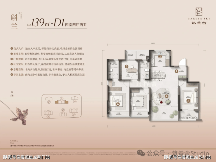 沐兰台以创新的全架空平台设计引领空间革命,将住区整体抬高5.1米,打造前所未有的立体生活体验。架空车库平台之上,特色主题架空层空间,直至住宅起始楼层,形成约9.1米的垂直抬升,使沐兰台的起始居住层享有传统住区四楼的日照高度,确保生活空间更加充盈阳光、清风和云霞之美,全面提升居住品质。