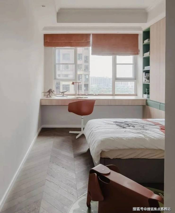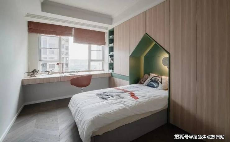 在窗户的一侧,巧妙地利用墙面空间,精心打造了一处凹龛设计。这里被巧妙地转化为了一组开放式书架,专为孩子心爱的书籍量身定制。这样的设计不仅充分利用了垂直空间,增加了收纳的灵活性,还让孩子能够轻松取阅书籍,培养对知识的热爱与探索欲。同时,开放式书架的设计也为儿童房增添了一抹书香气息,让学习与成长的氛围更加浓厚。