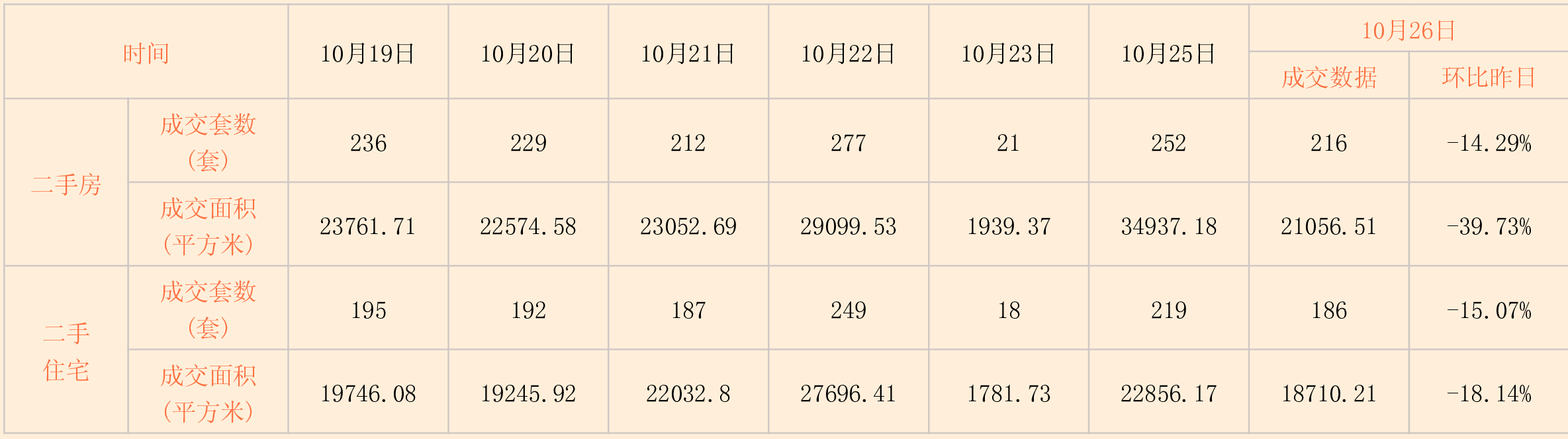 10月26日,苏州市二手房成交216套,环比昨日下降14.29%,二手房成交面积21056.51㎡,环比昨日下降39.73% ;其中,二手住宅成交186套,环比昨日下降15.07%,二手住宅成交面积18710.21㎡,环比昨日下降18.14% 。