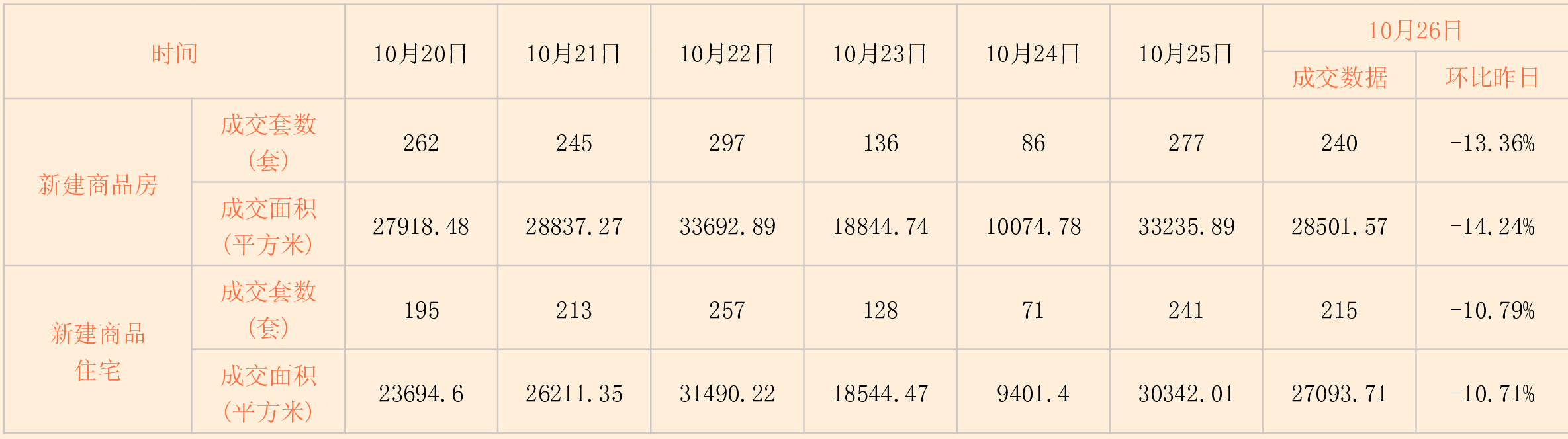 10月26日,苏州市新建商品房成交240套,环比昨日下降13.36%,新建商品房成交面积28501.57㎡,环比昨日下降14.24% ;