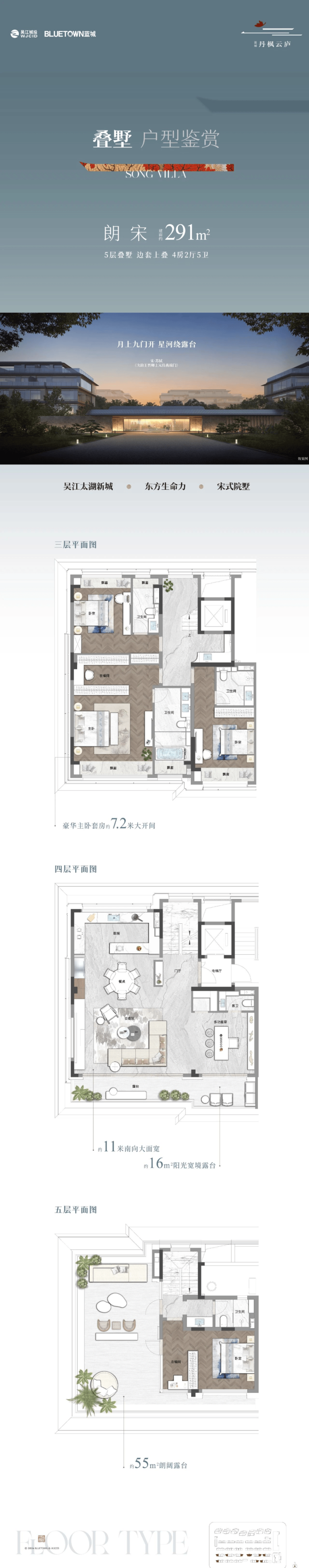 这次,蓝城集团携手吴江城投,在吴江太湖新城的核心地带,庞杨路南、秋枫街西,一口气拿下了6.9万方的土地,打造了一个容积率只有1.6的低密社区。整个项目建面约17万方,规划了11栋5层的叠墅、12栋7层的叠墅,还有7栋16-17层的小高层。产品线也很清晰,主力户型是约200-300平米的创新宋风院墅,和约169-258平米的奢阔平层大宅,妥妥的改善型高端盘。
