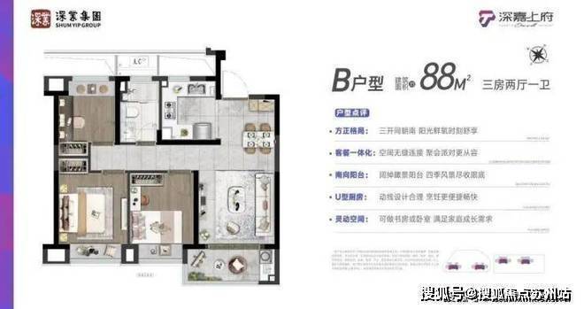 深嘉上府售楼处营销中心:400-8828-814深嘉上府售楼处电话/地址☎:400-882-8814(开发商热线)建面约88㎡三房两厅一卫:采用南向三开间设计,两间卧室朝南,面宽媲美市面100㎡户型.U型厨房动线合理,餐厅可容纳四人就餐.全屋飘窗设计增加赠送面积,提升居住舒适度.
